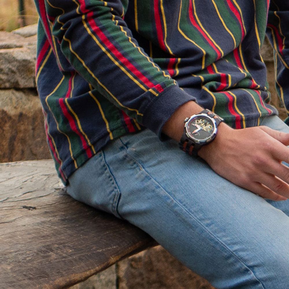 Reap the benefits of everything that fine woods like ebony and rosewood have to offer in this stunning, handcrafted dual wheel automatic watch. As hypoallergenic materials, ebony and rosewood offer the perfect solution for the wearer with sensitive skin.